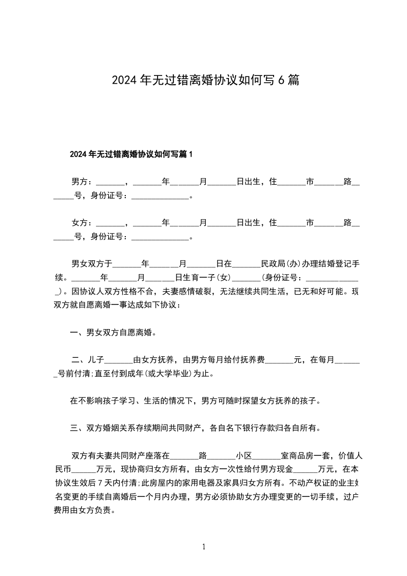 2024年无过错离婚协议如何写篇1
