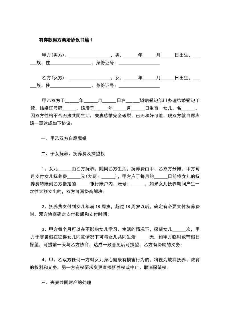 有存款男方协议离婚书如何写篇3