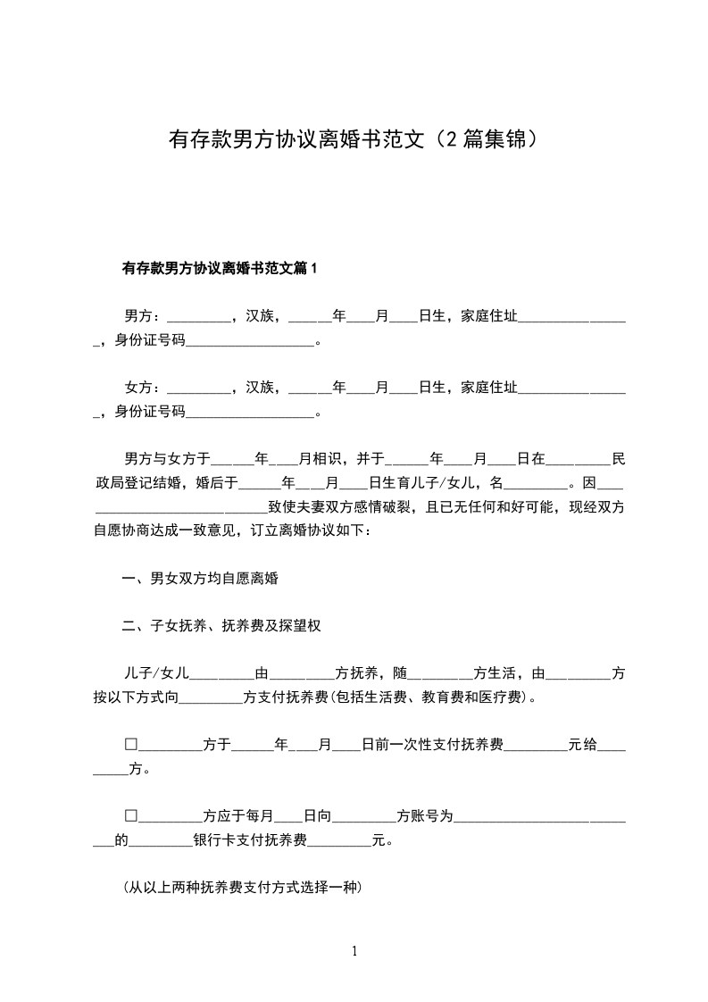 有存款男方协议离婚书如何写篇1
