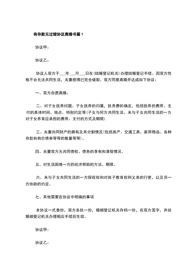 有存款无过错离婚协议参考样例篇7
