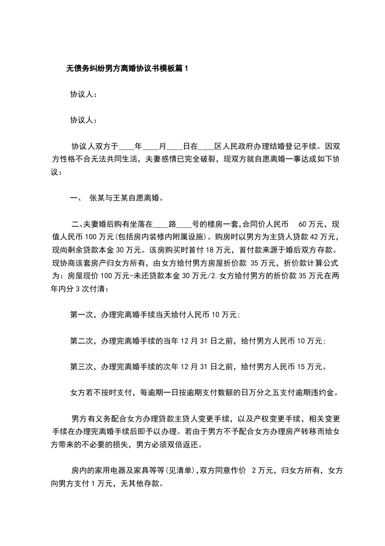 无债务纠纷男方离婚协议书模板篇1