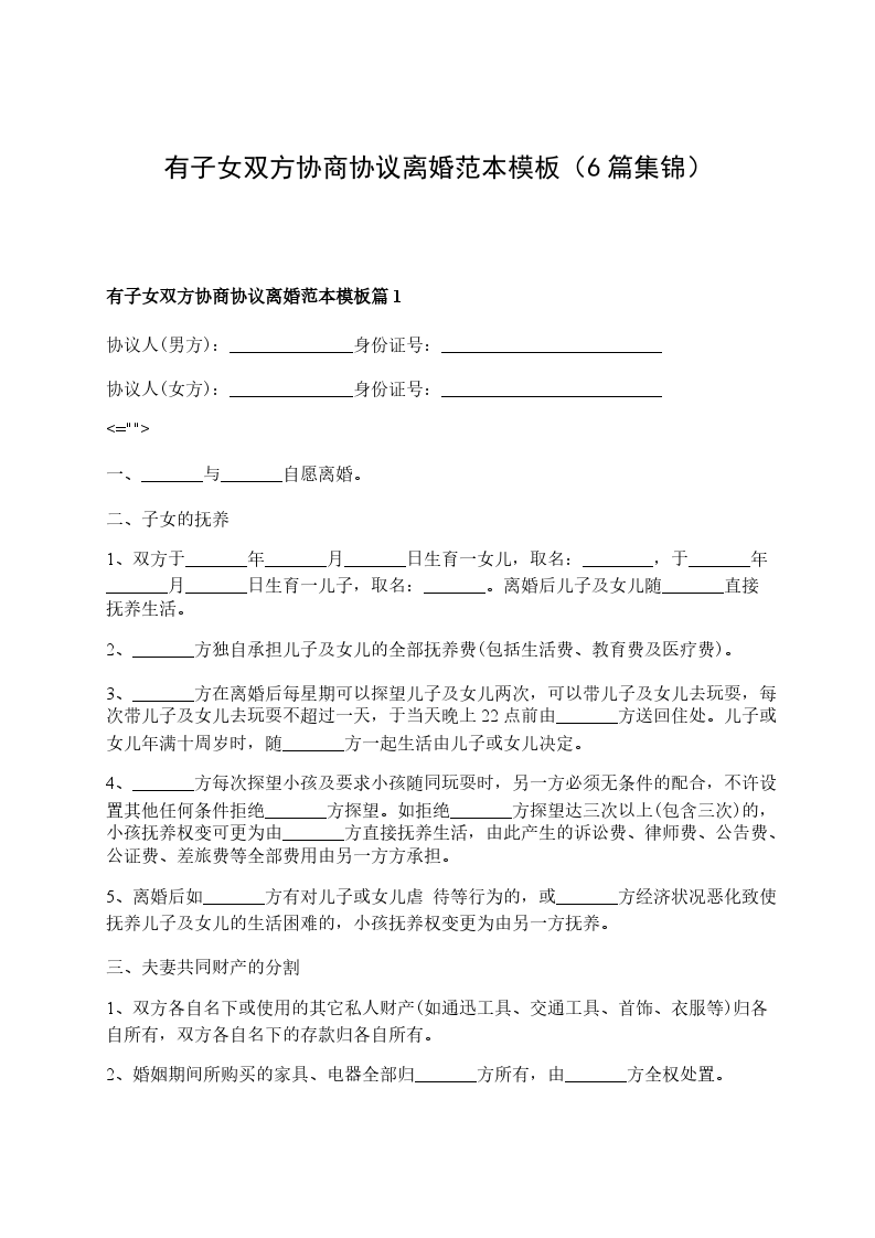 协议人双方于_______年_______月_______日登记结婚,_______年_______月_______日生育一子,取名_______。现协议双方夫妻感情确已完全破裂,经双方协商一致,自愿离婚、财产分割及子女抚养事宜达成如下协议: