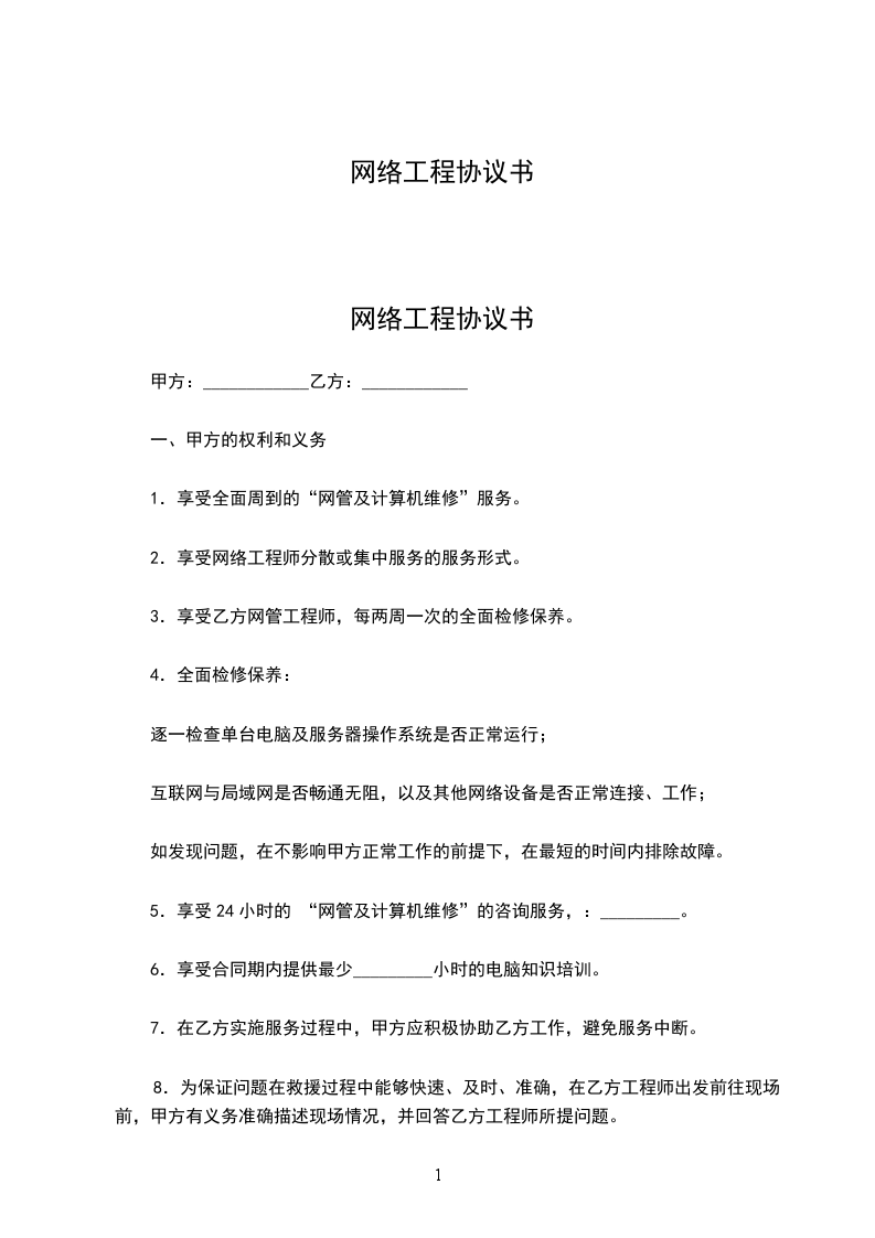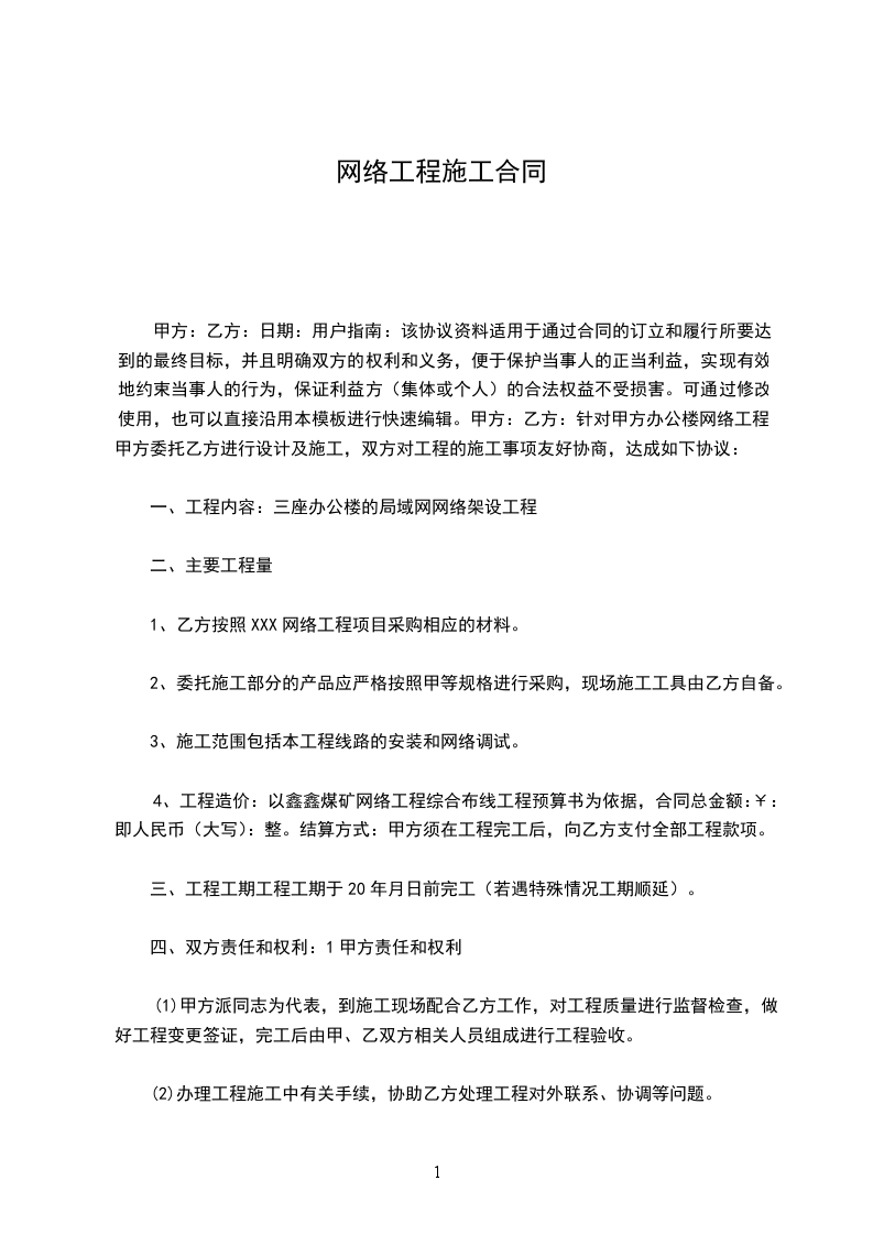 1.甲方同意乙方来承建甲方的网络工程,在承建过程中,乙方会按照甲方的要求的时间内完成乙方销售给甲方的设备的安装和调试,甲方承担配合乙方进行安装和调试的各项工作。