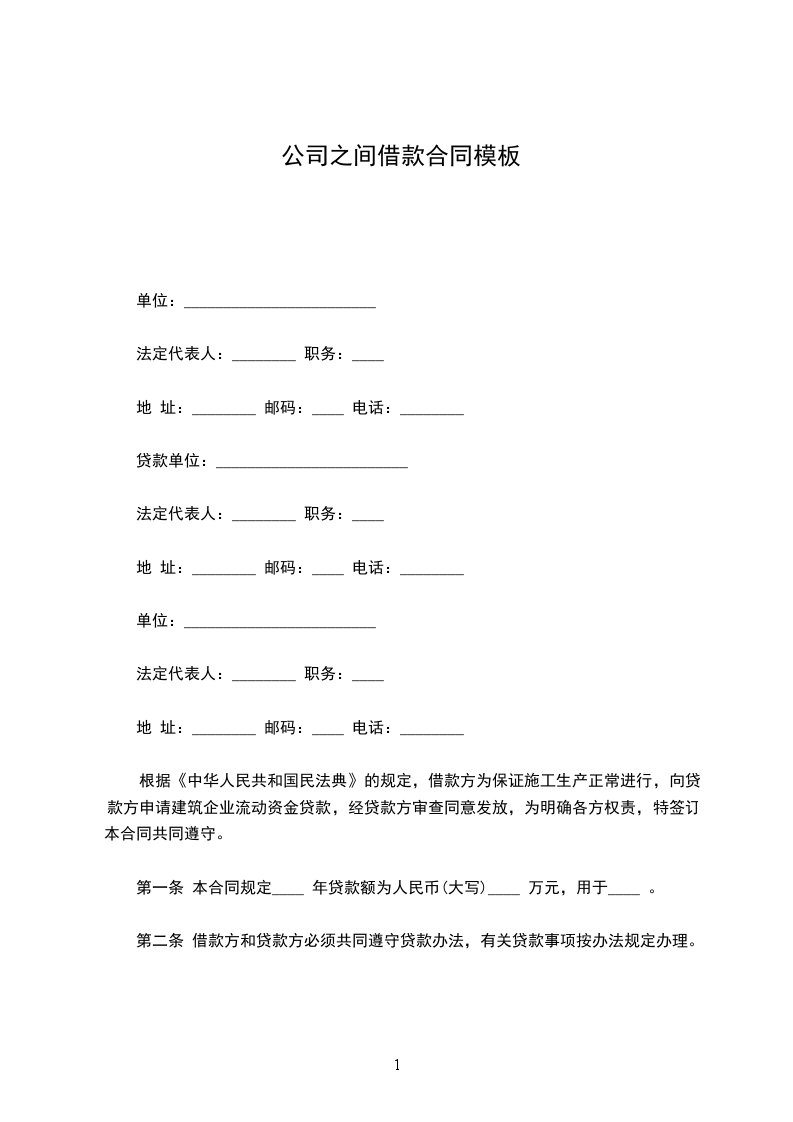 第一条 本合同规定____ 年贷款额为人民币(大写)____ 万元,用于____ 。