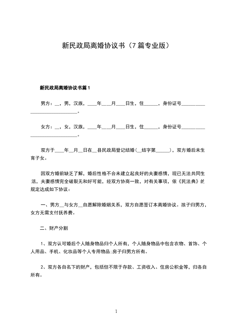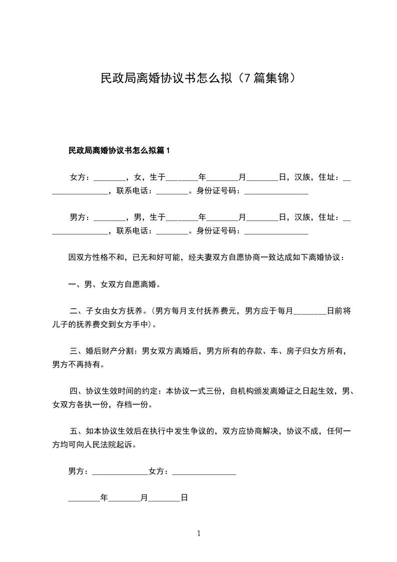 男方__与女方__于____年__月认识,于____年__月__日在__市民政局登记结婚,婚后于____年__月__日生育一儿子,名___。两人因性格不合,致使夫妻感情破裂,已无和好可能,现经夫妻双方自愿协商达成一致意见,订立离婚协议如下: