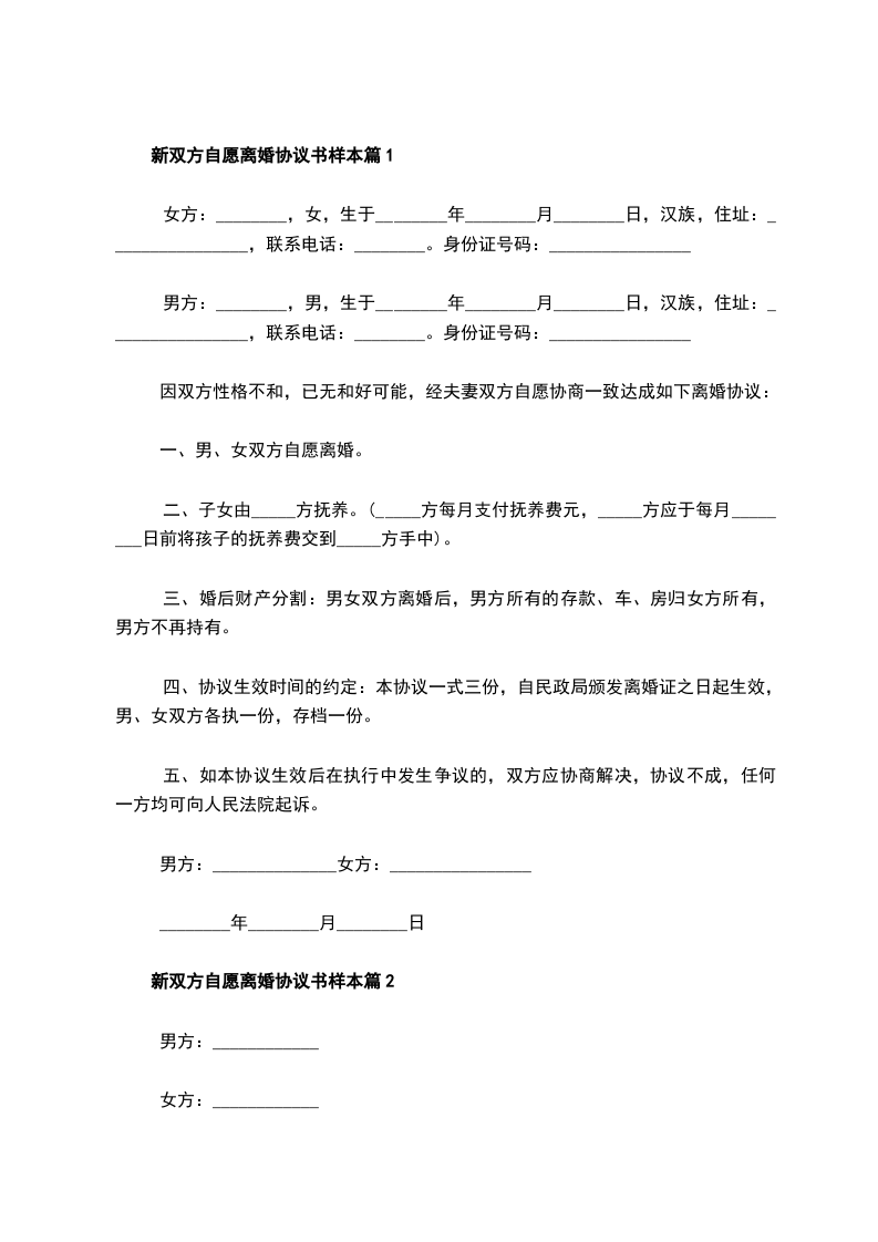 新双方自愿离婚协议书样本篇2