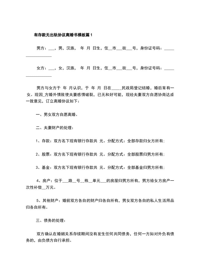 1、存款:双方名下现有银行存款共 元。分配方式:全部存款归女方所有;