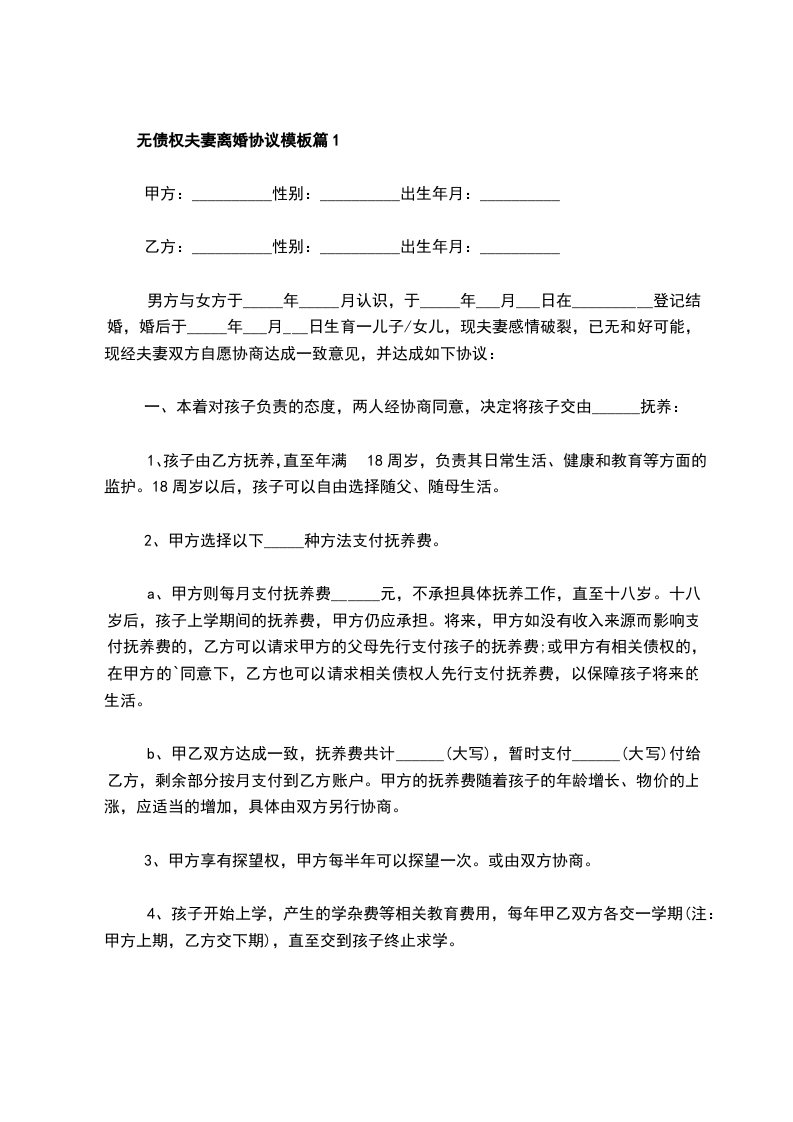 无债权夫妻离婚协议模板篇1