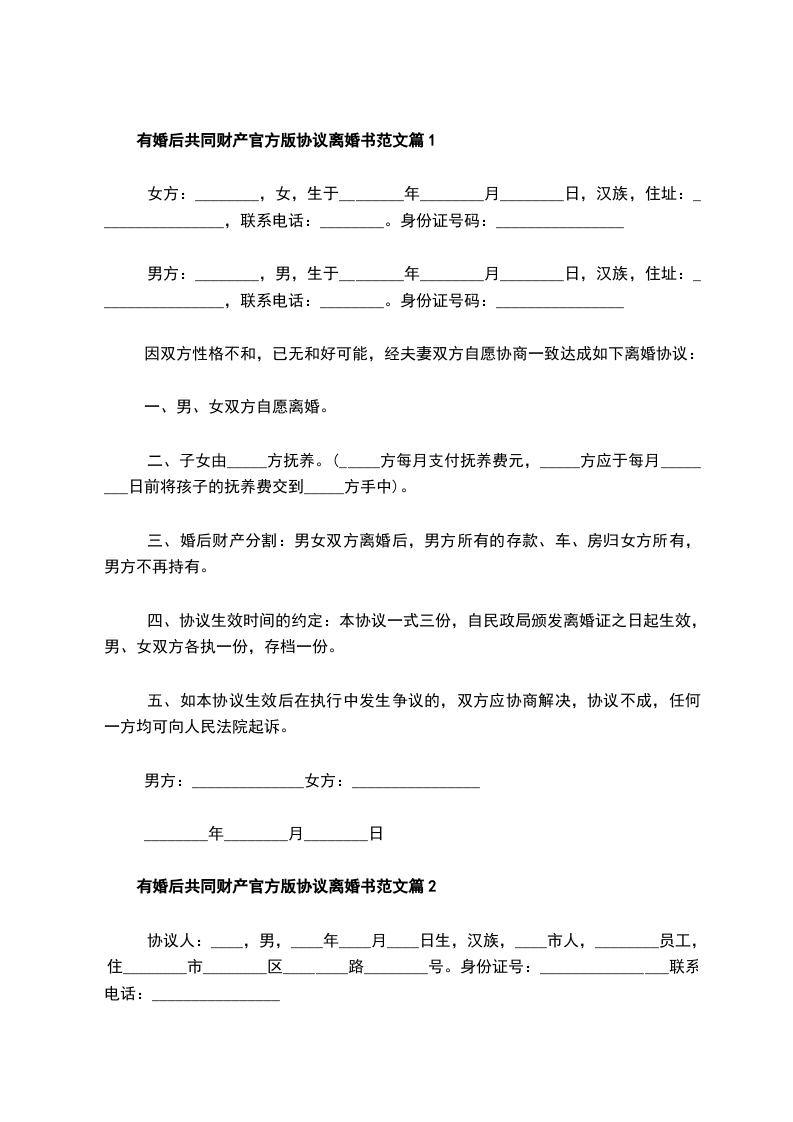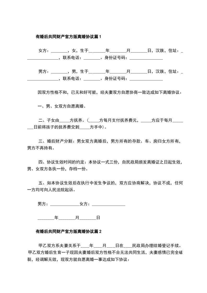 1.存款:双方名下现有银行存款共元,双方各分一半,为元。分配方式:各自名下的存款保持不变,但男方/女方应于年月日前一次性支付元给女方/男方。