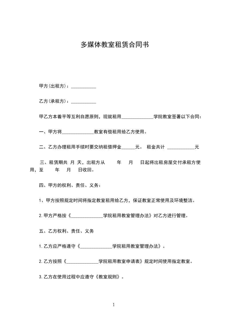 甲乙方本着平等互利自愿原则,现就租用______________学院教室签署以下合同: