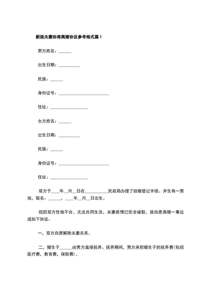 男方______与女方______于______年______月认识,于______年______月______日在______市民政局登记结婚,婚后于______年______月______日生育一儿子,名______。两人因性格不合,致使夫妻感情破裂,已无和好可能,现经夫妻双方自愿协商达成一致意见,订立离婚协议如下: