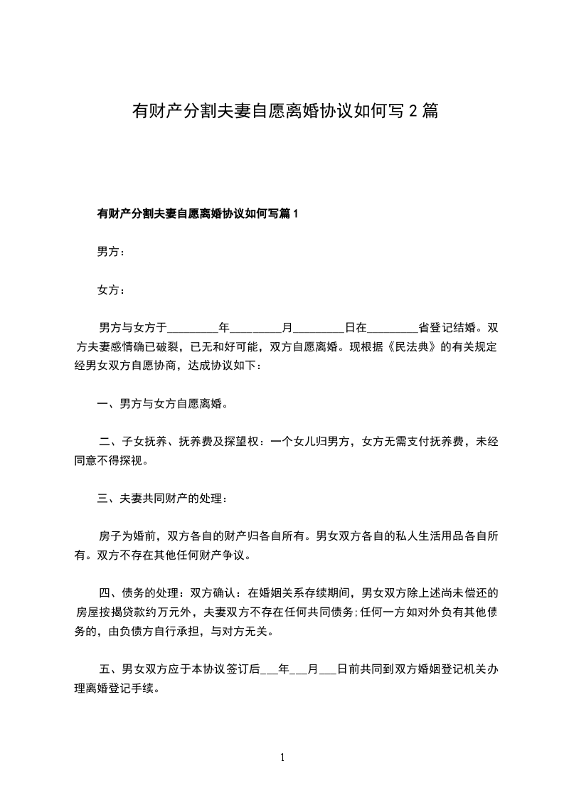 男方与女方于_________年_________月_________日在_________省登记结婚。双方夫妻感情确已破裂,已无和好可能,双方自愿离婚。现根据《民法典》的有关规定,经男女双方自愿协商,达成协议如下: