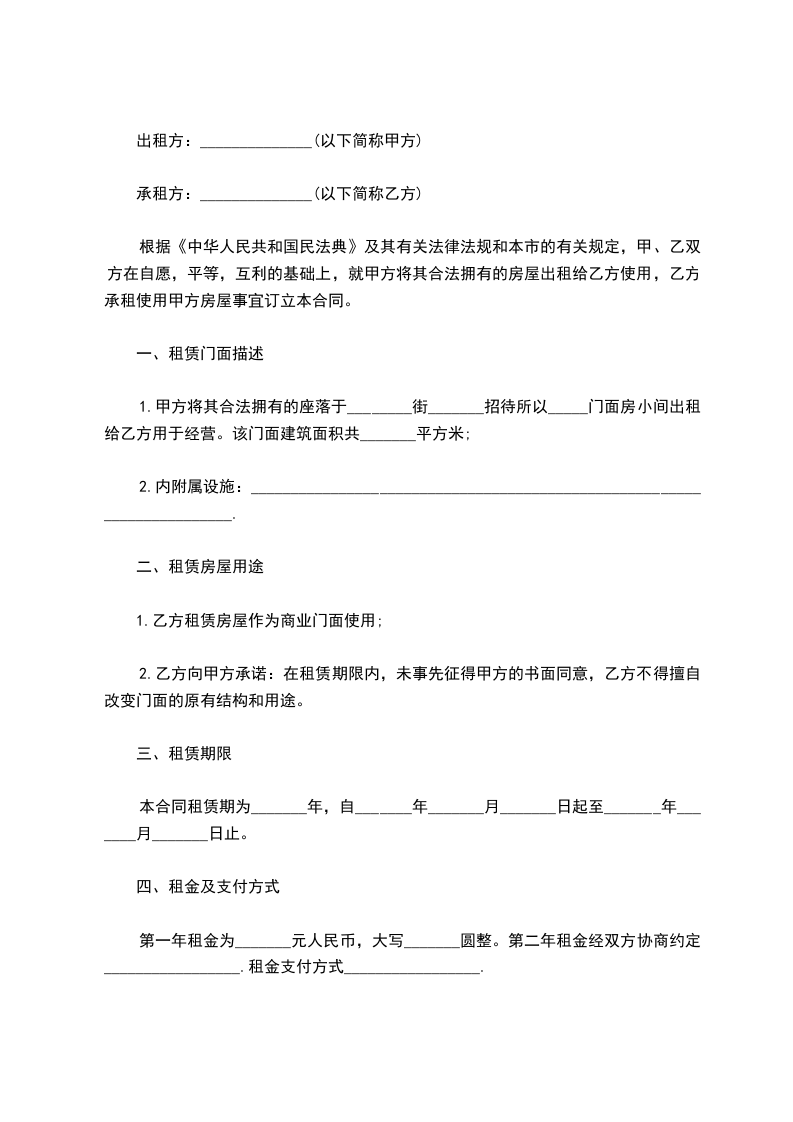 1.甲方将其合法拥有的座落于________街_______招待所以_____门面房小间出租给乙方用于经营。该门面建筑面积共_______平方米;