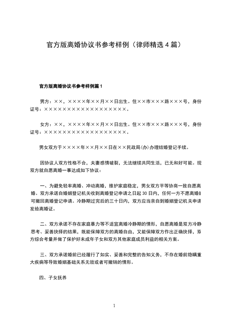 官方版离婚协议书参考样例篇1