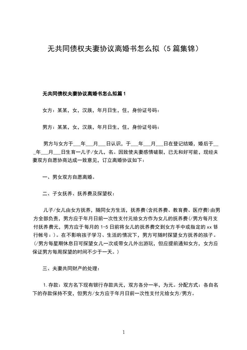 无共同债权夫妻协议离婚书怎么拟篇5