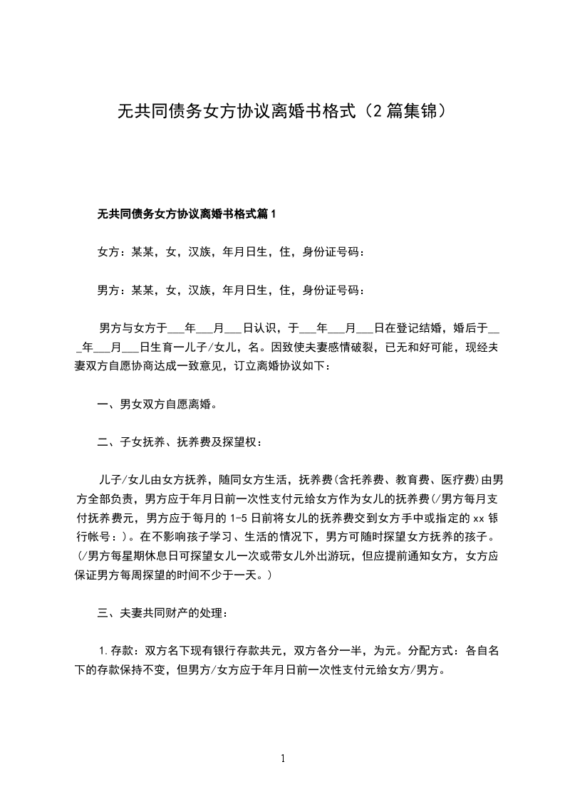 三、夫妻婚姻关系存续期间共同存款归女方,其他房产及存款婚前所得,归各自所有,无共同债务清偿,今后若发现债权、债务,各自经手或立据的债权由各自受益,各自经手或立据的债务由各自清偿,双方互不干涉。