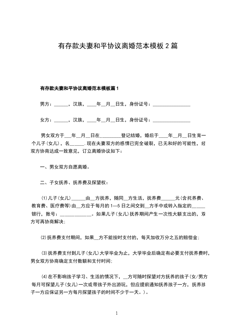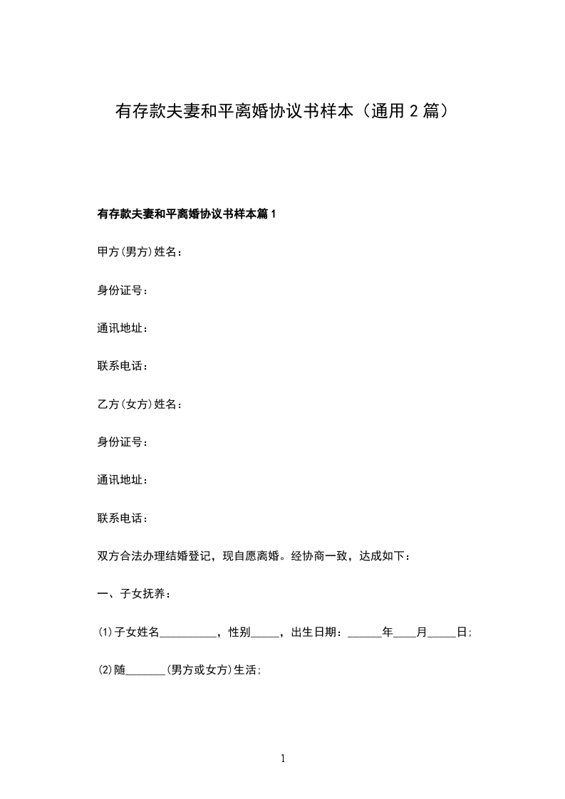 (1)存款:双方名下现有银行存款共______元,双方各分一半,为______元。分配方式:各自名下的存款保持不变,但男方(女方)应于____年__月__日前一次性支付____元给女方(男方)。