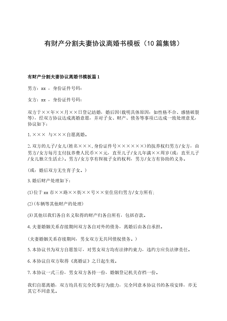 有财产分割夫妻离婚协议书参考格式篇10