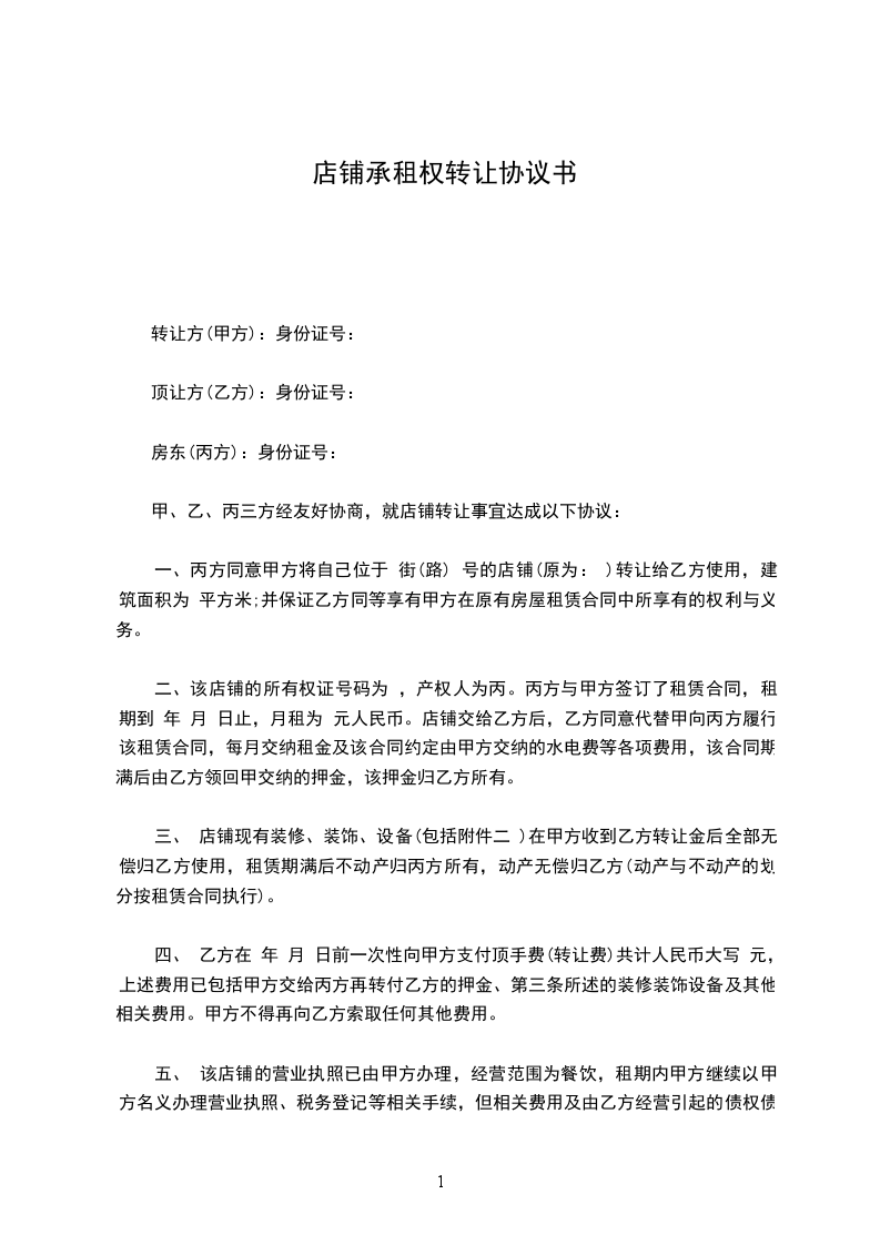 甲、乙、丙三方经友好协商,就店铺转让事宜达成以下协议: