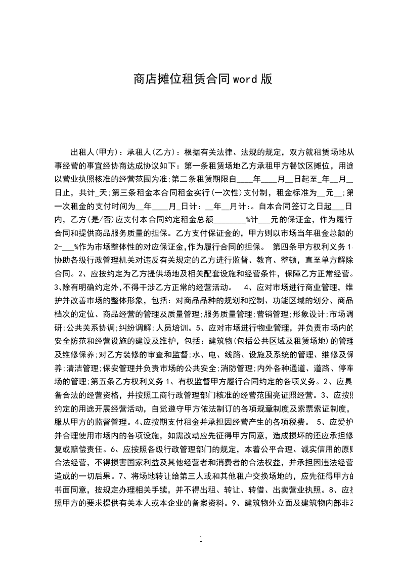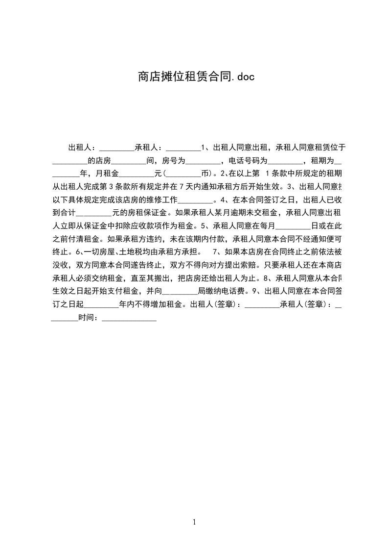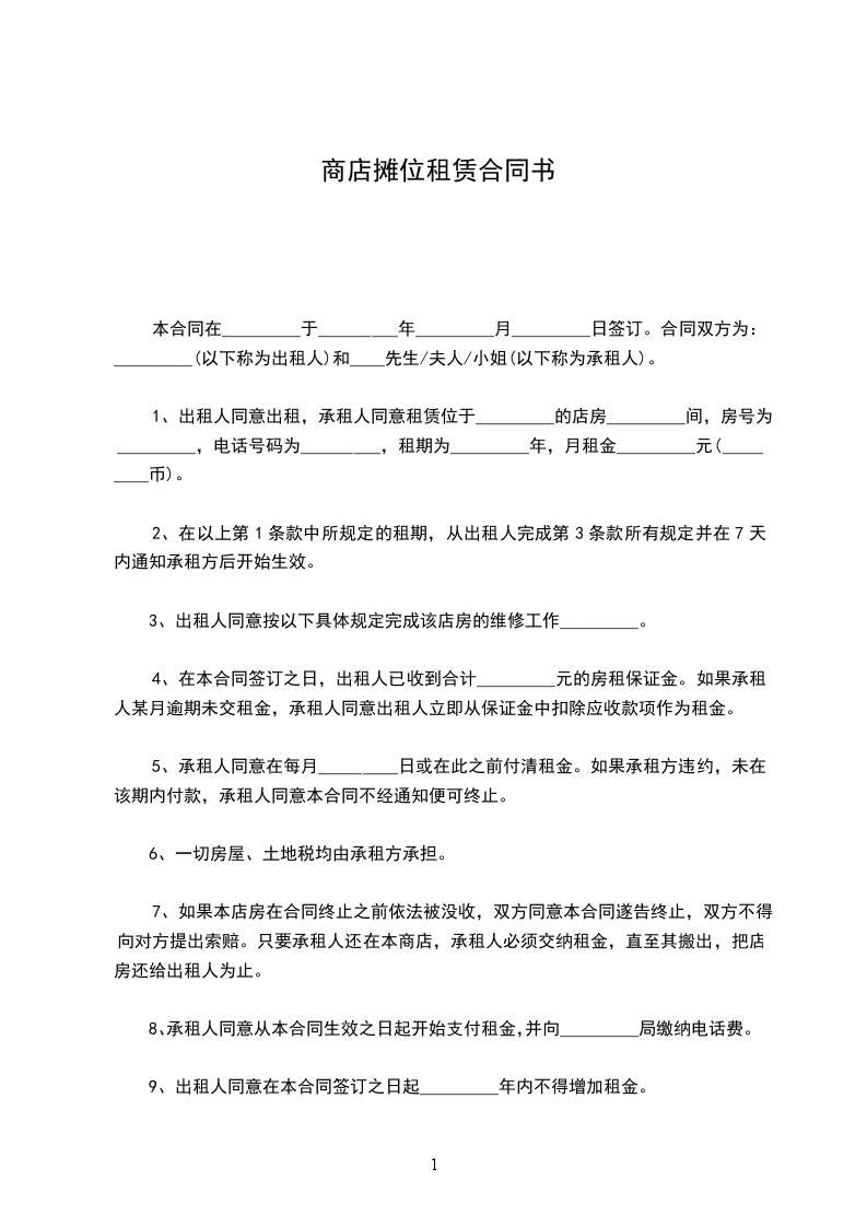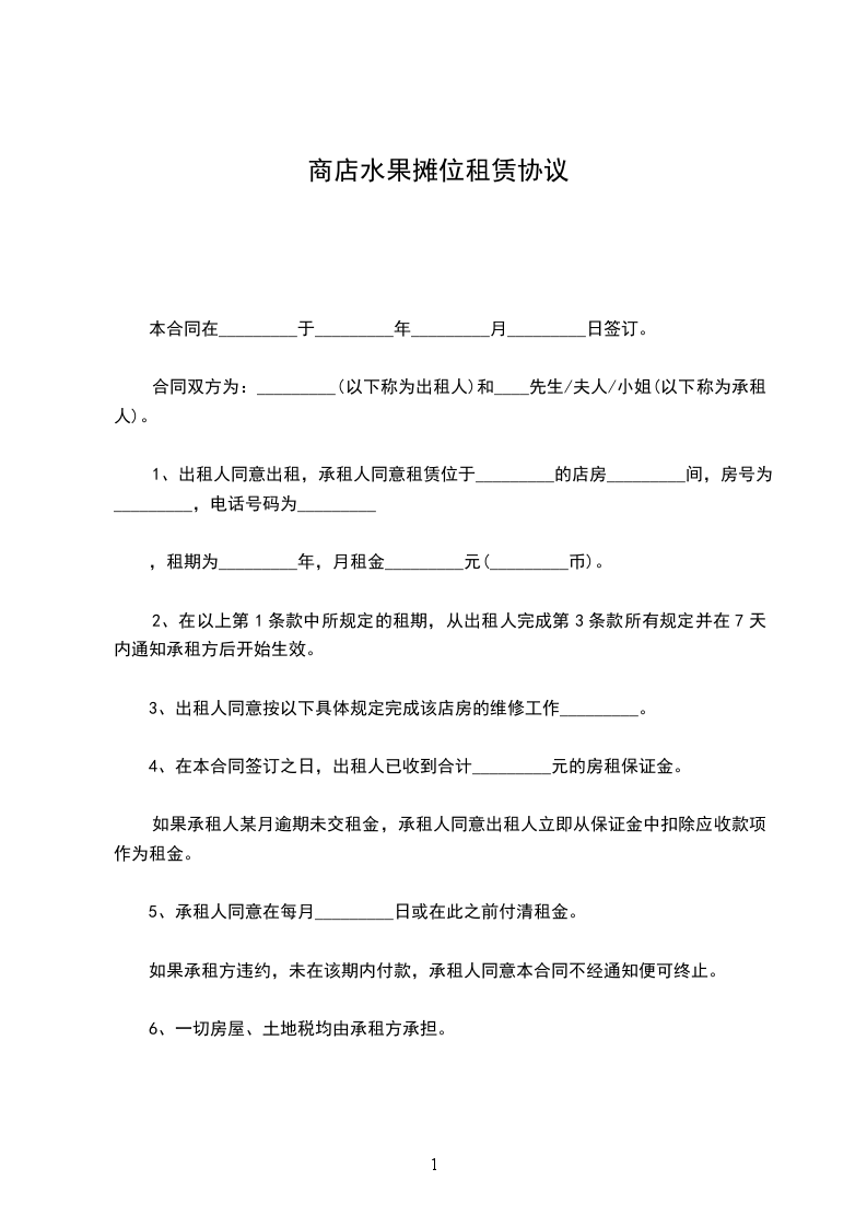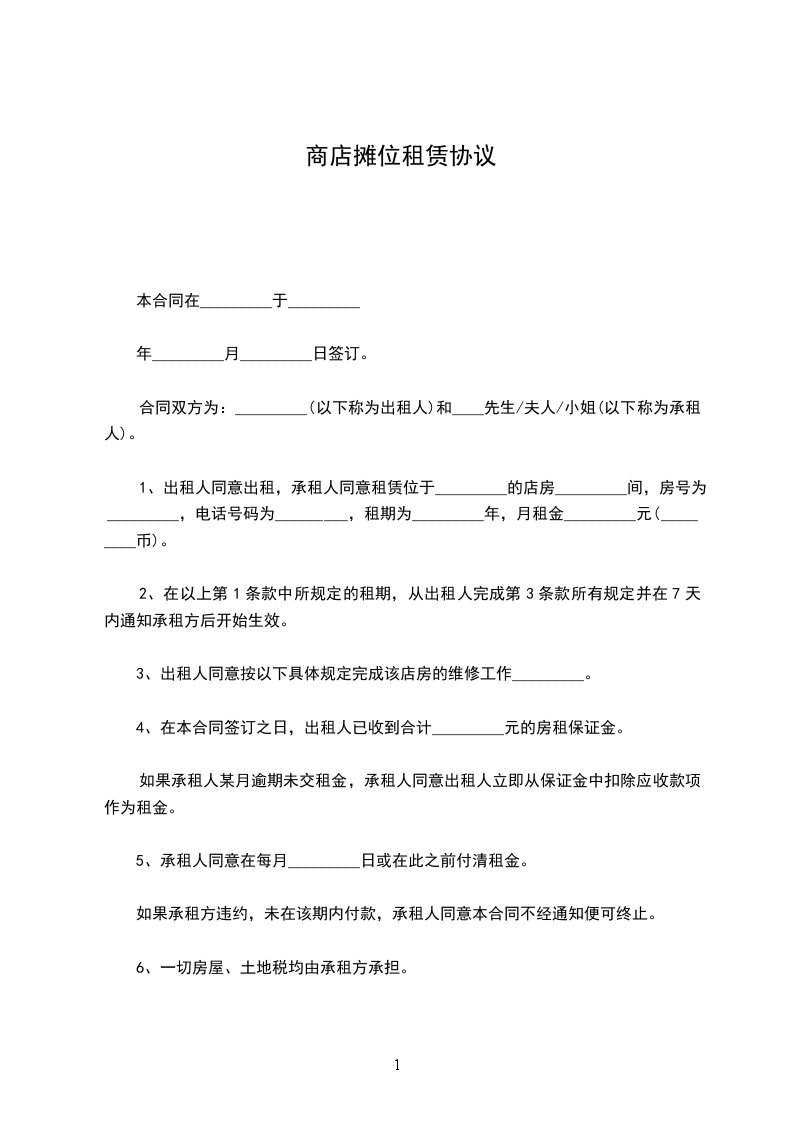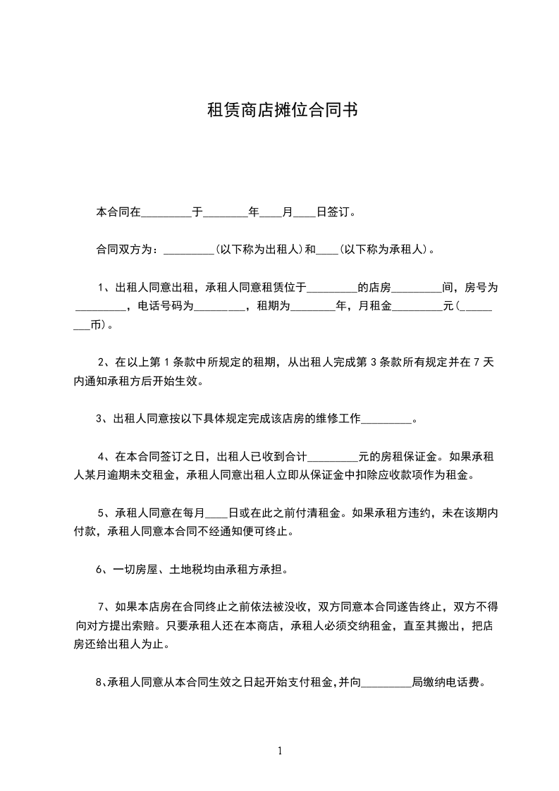 1、出租人同意出租,承租人同意租赁位于_________的店房_________间,房号为_________,电话号码为_________,租期为_________年,月租金_________元(_________币)。