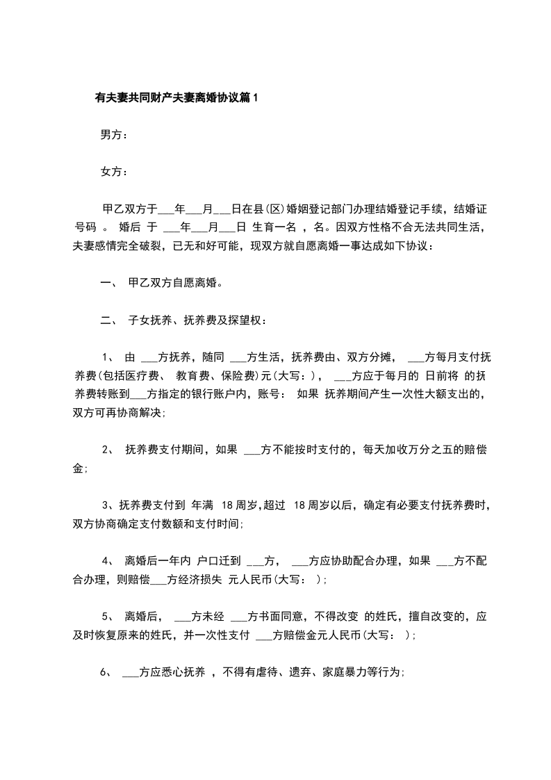 男方__与女方__于____年__月认识,于____年__月__日在__市民政局登记结婚,婚后于____年__月__日生育一儿子,名___。两人因性格不合,致使夫妻感情破裂,已无和好可能,现经夫妻双方自愿协商达成一致意见,订立离婚协议如下: