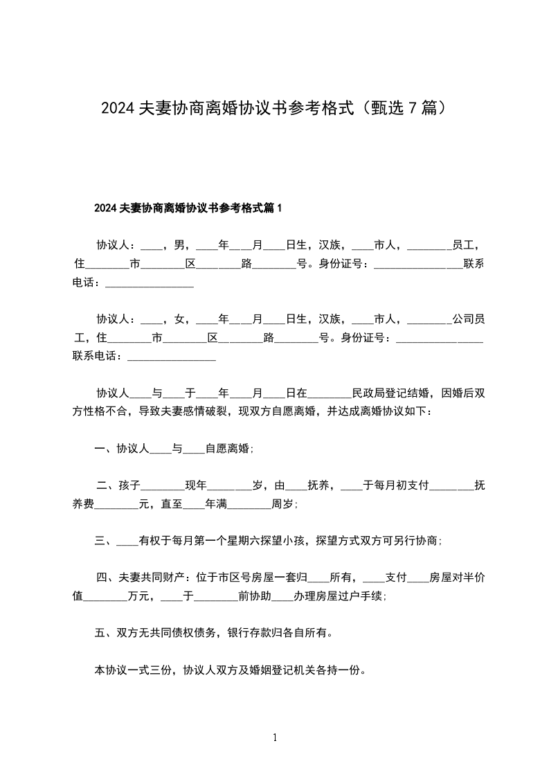 2024夫妻协商协议离婚书参考格式篇7