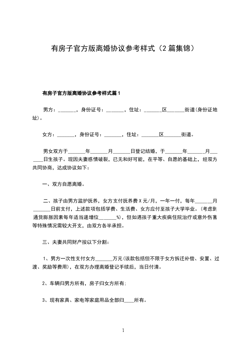 三、双方有夫妻共同财产座落在______路______小区______室商品房一套,价值人民币______万元,现协商归女方乙方所有,由女方一次性给付男方甲方现金______万元,此款在本协议签订后的第二天付清;此房内的家用电器及家俱归女方所有,存款归女方所有。
