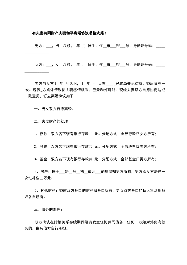 有夫妻共同财产夫妻和平离婚协议书格式篇1