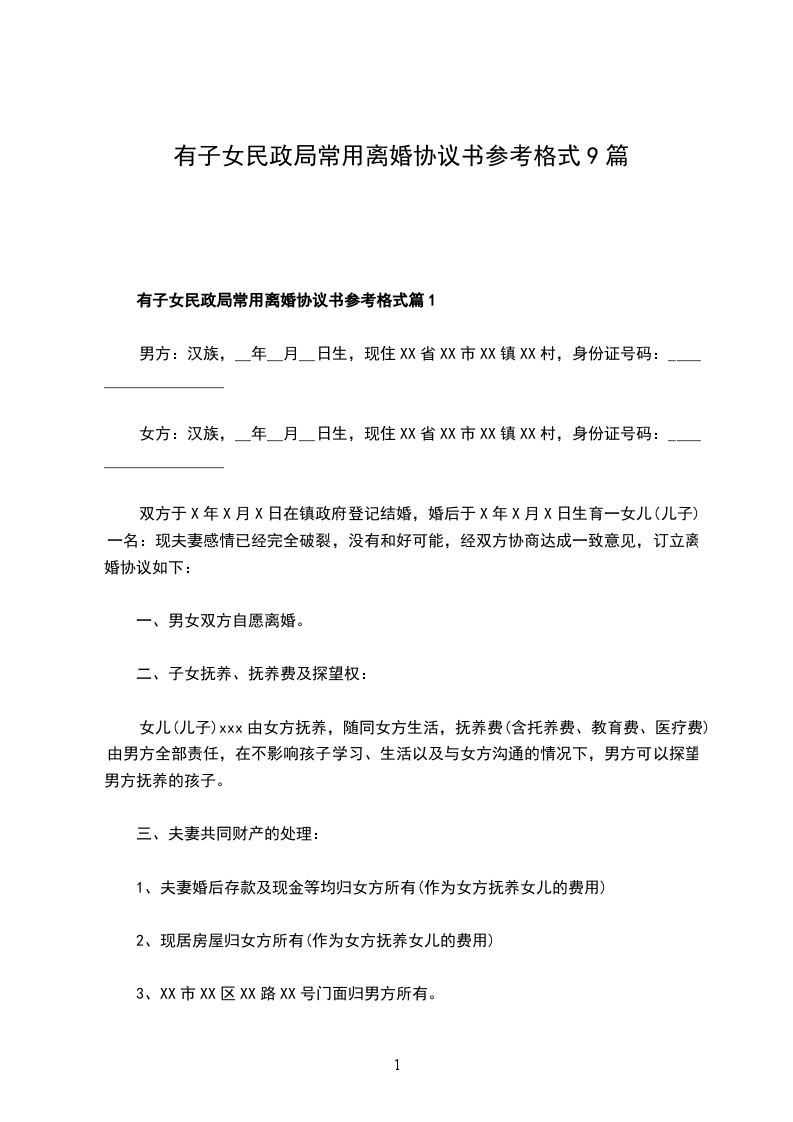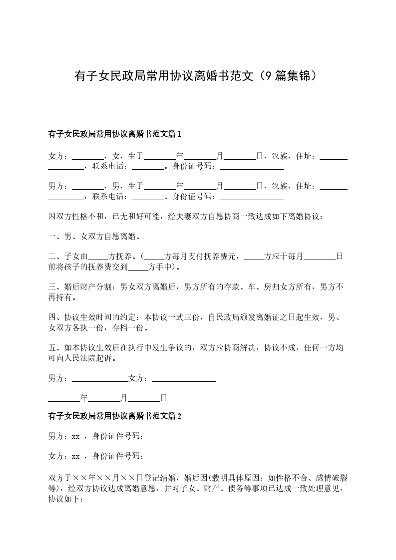 有子女民政局常用离婚协议篇9