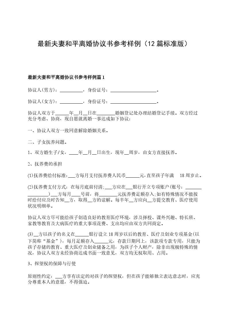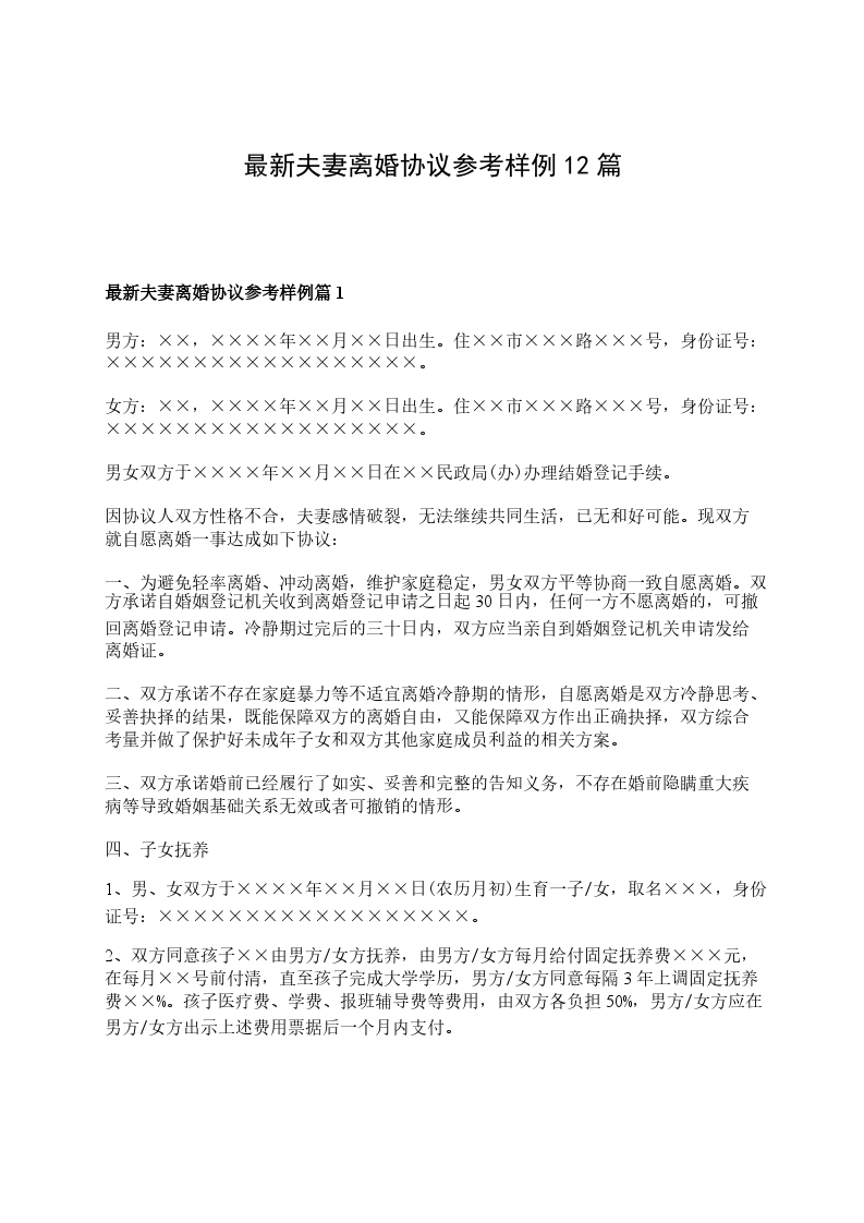 最新夫妻离婚协议参考样例篇12