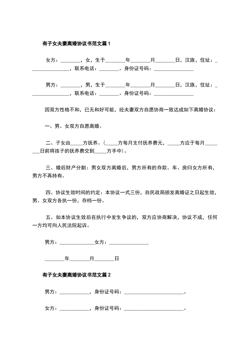 有子女夫妻离婚协议书范文篇2