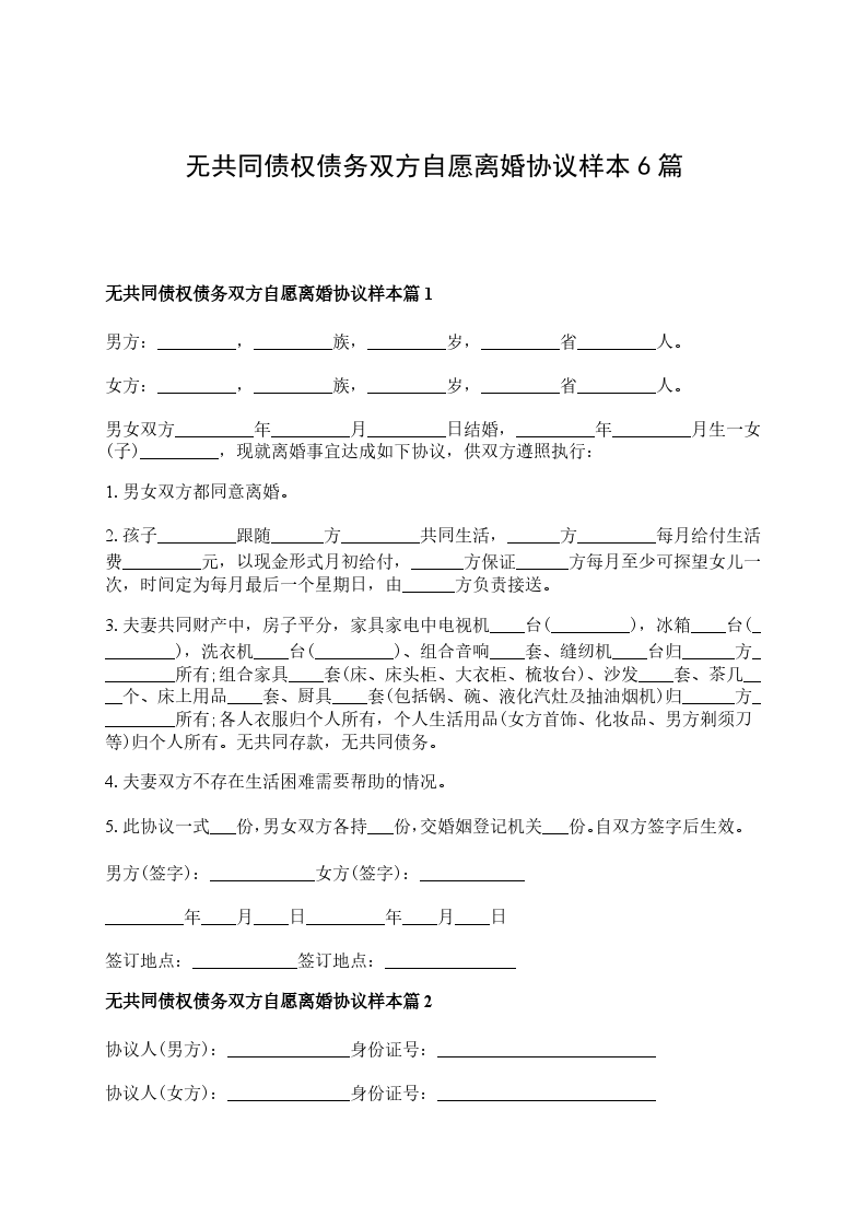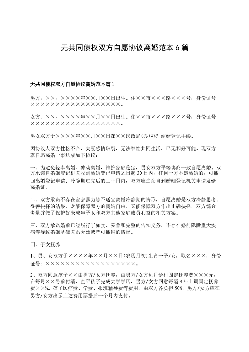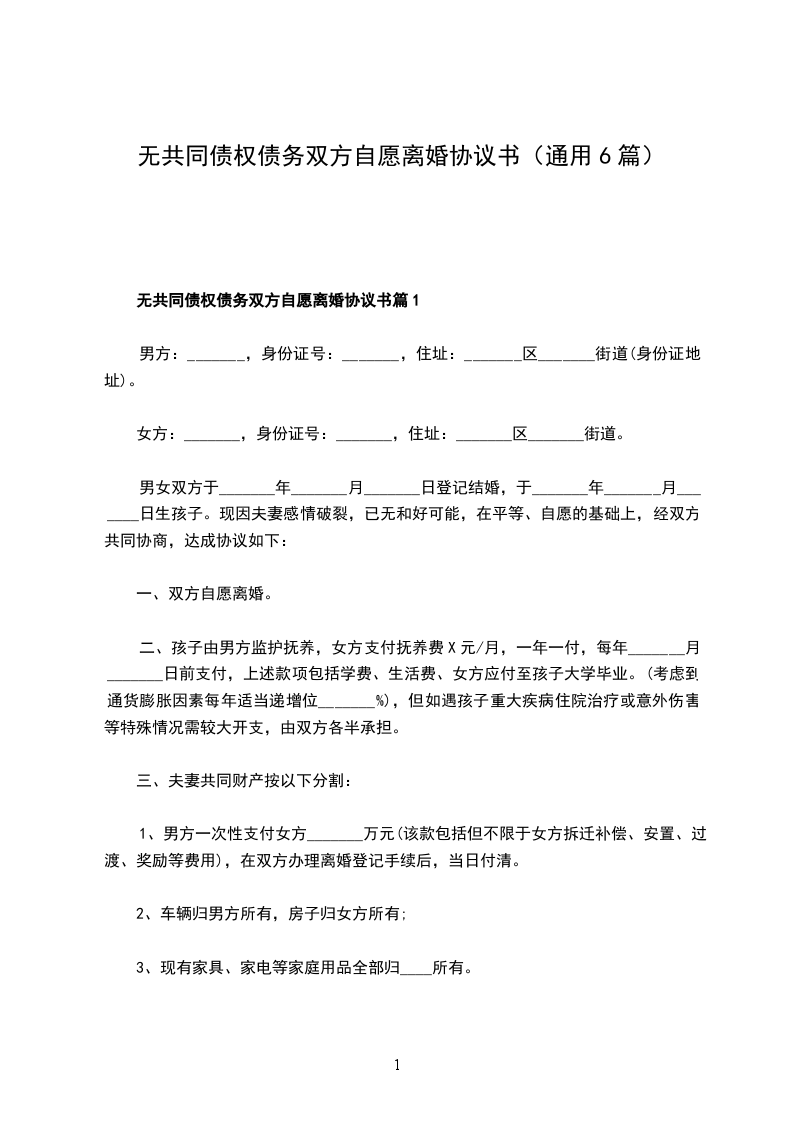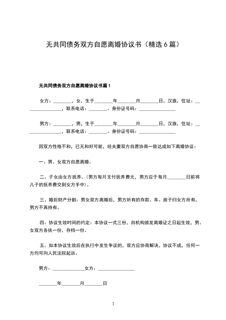一、________与________自愿离婚,今后各自婚姻互不干涉。