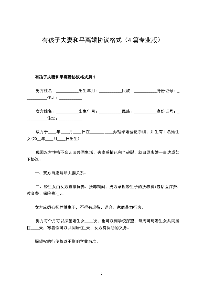 男女双方_________年_________月_________日结婚,_________年_________月生一女(子)_________,现就离婚事宜达成如下协议,供双方遵照执行: