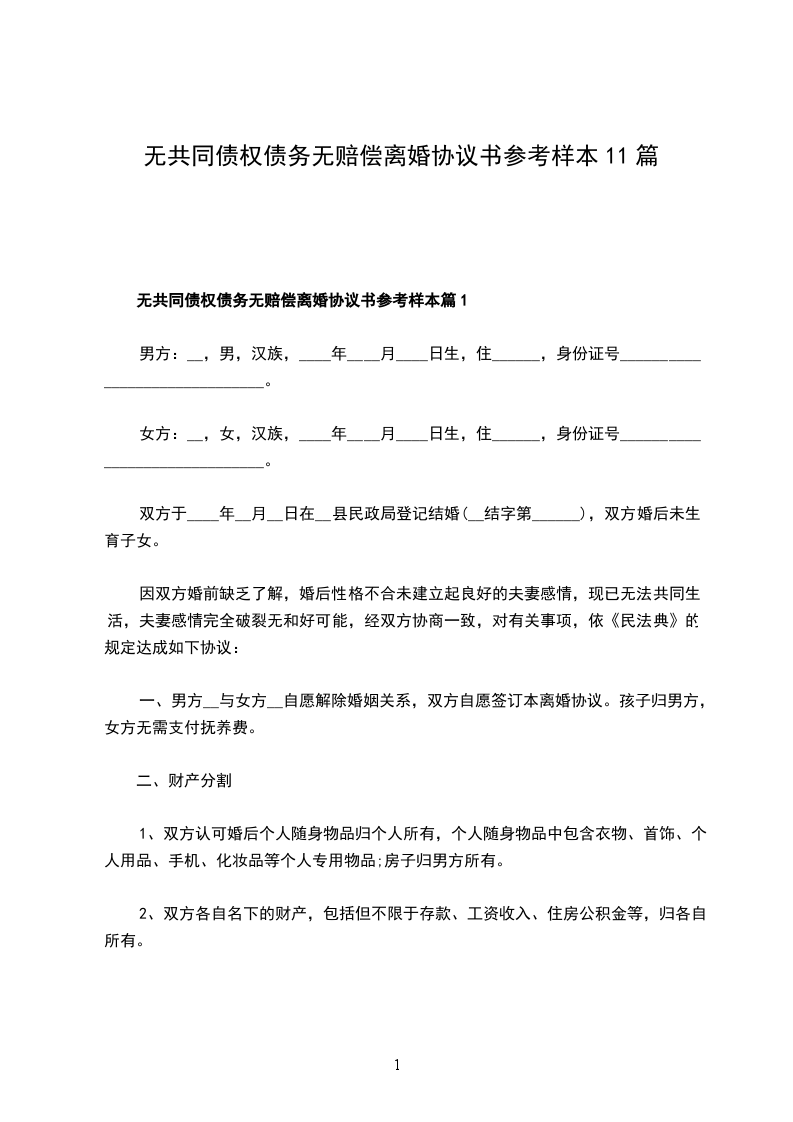 无共同债权债务协议离婚书参考样本篇11
