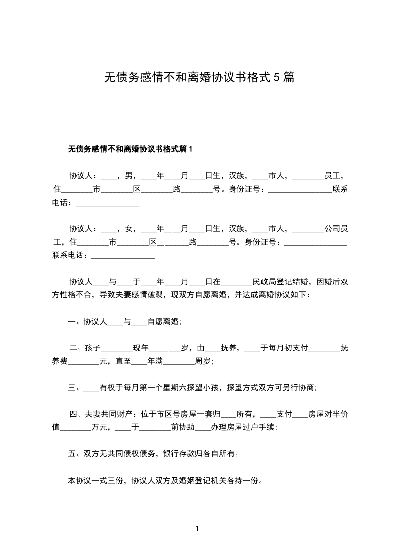 无债务感情不和离婚协议书格式篇5