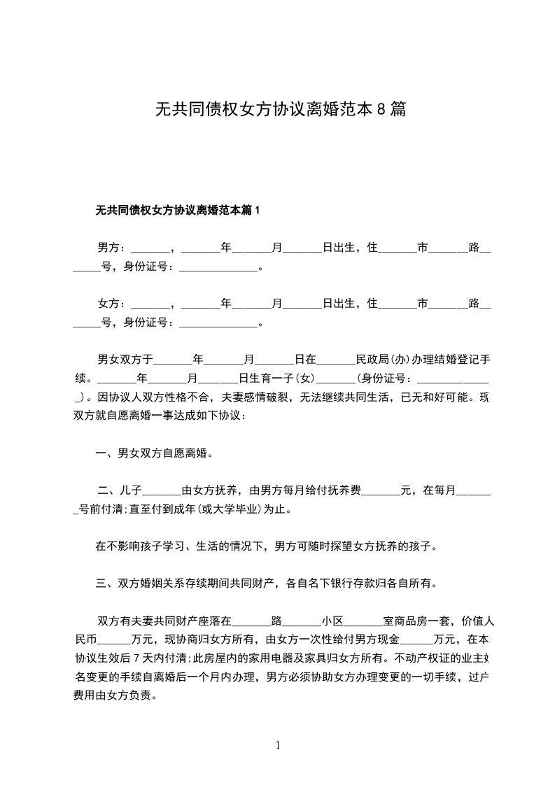 无共同债权女方协议离婚范本篇8