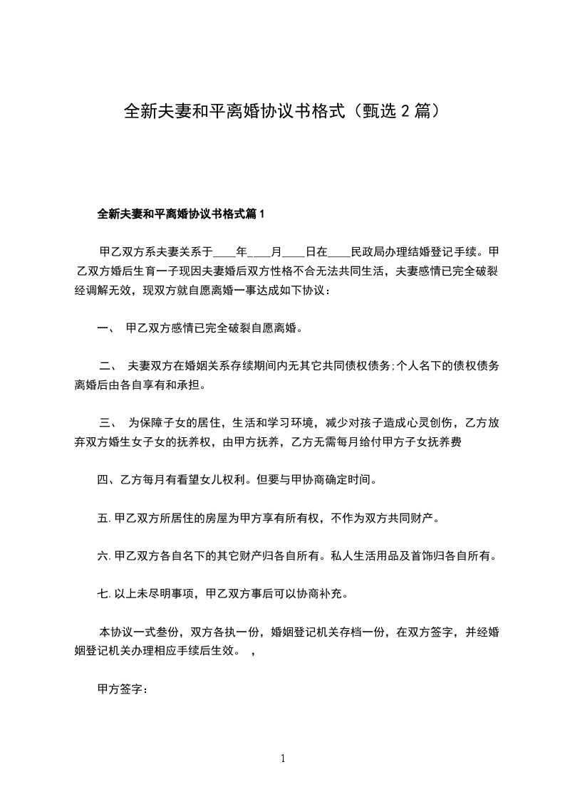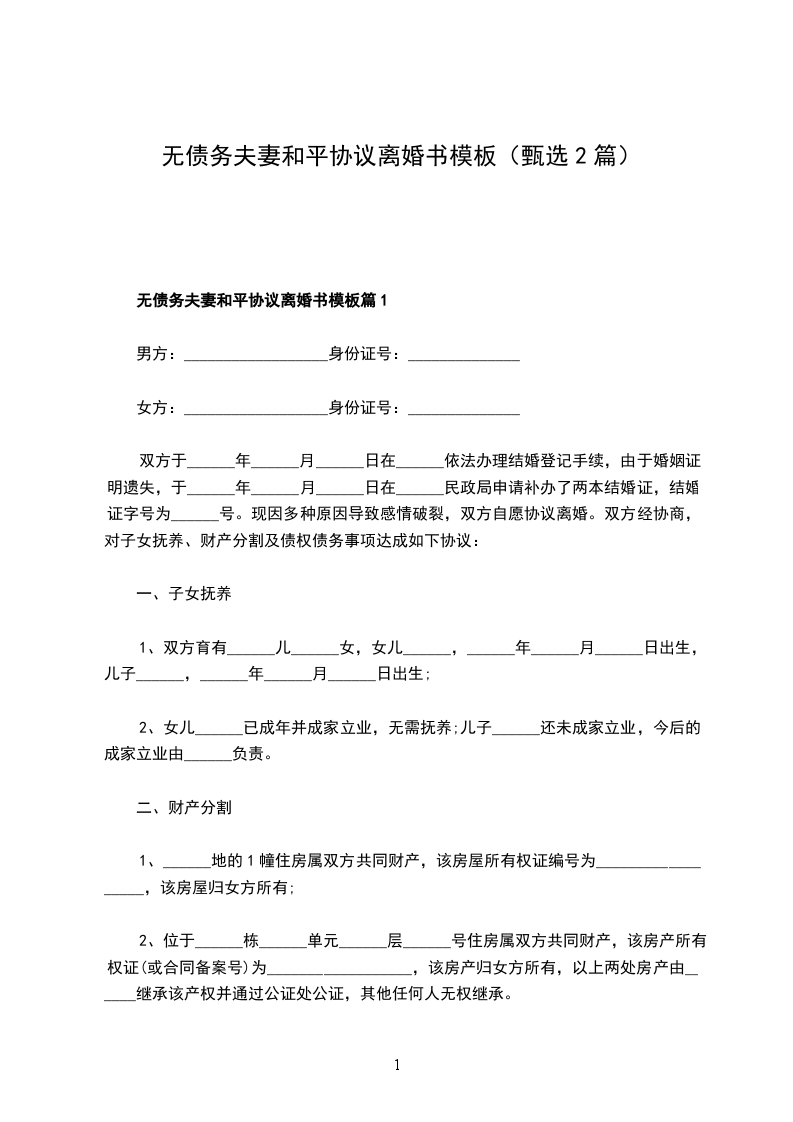 无债务夫妻和平协议离婚书模板篇1