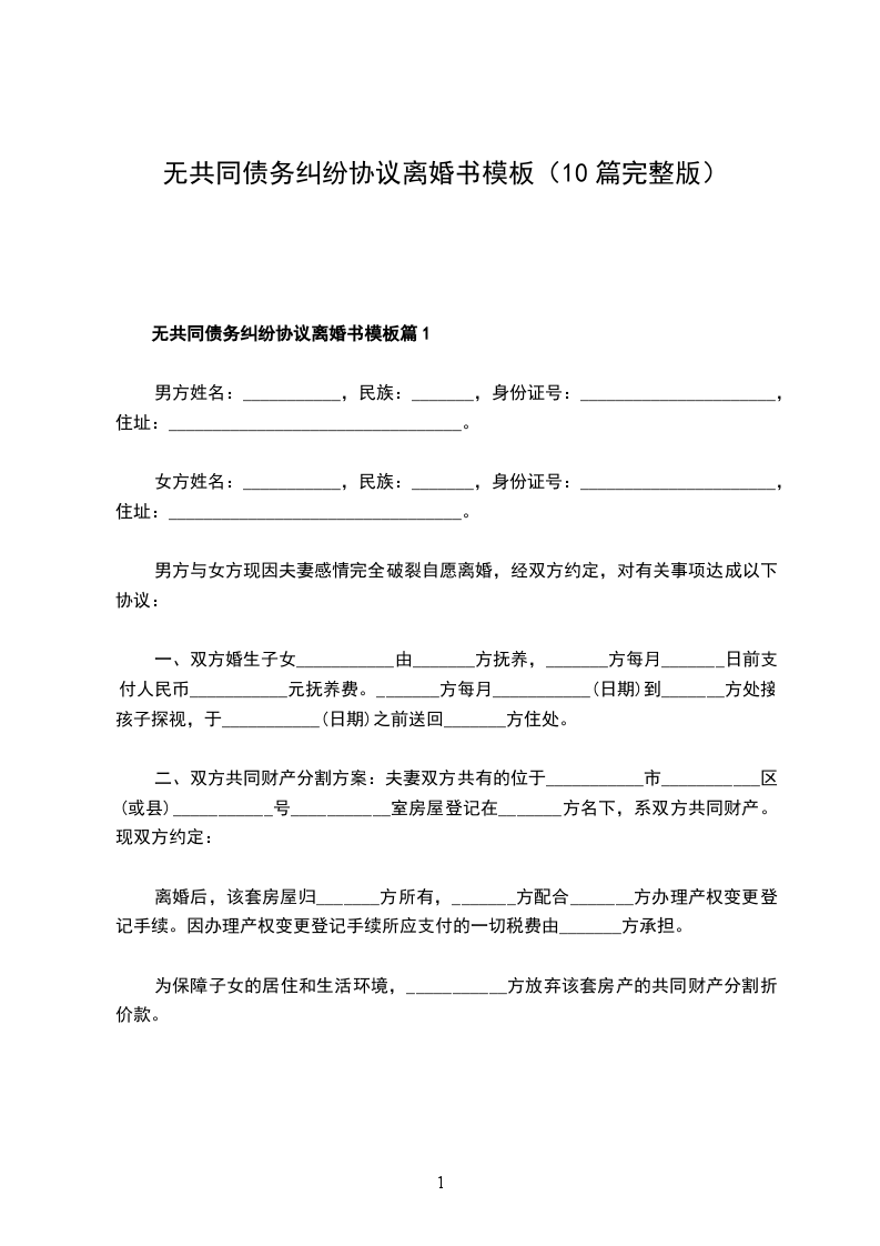 无共同债务纠纷协议离婚书模板篇10