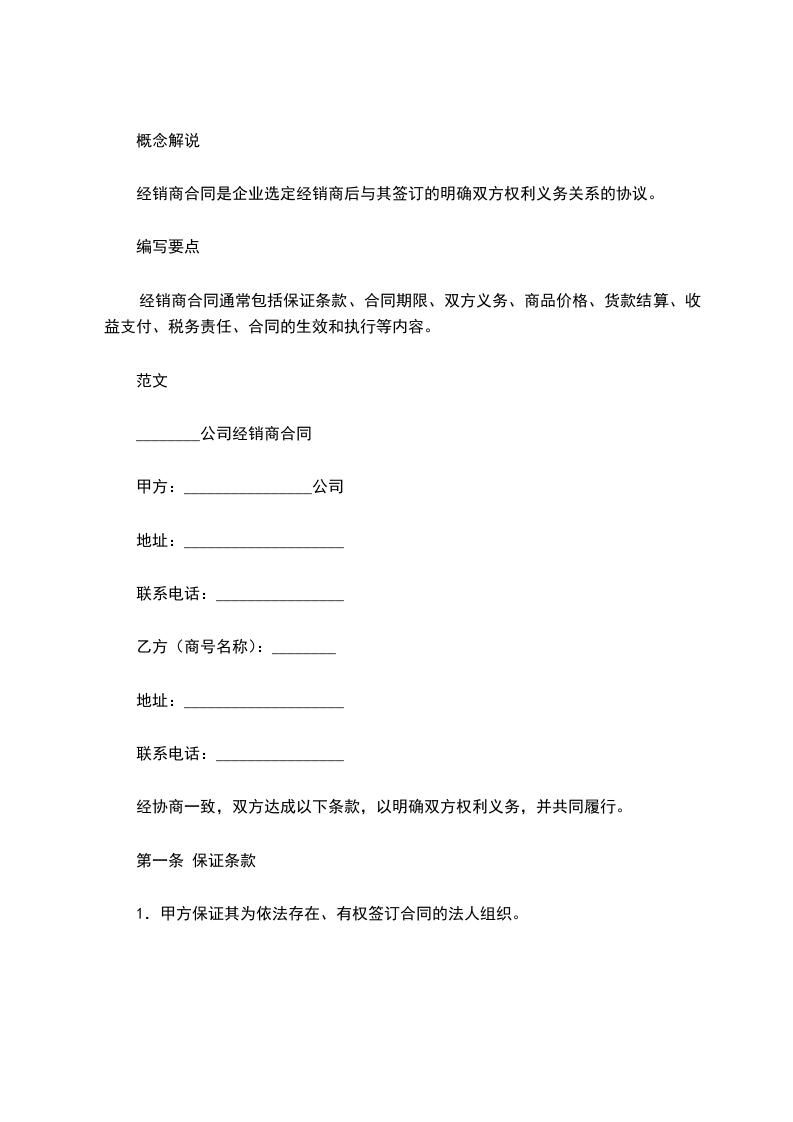 经销商合同通常包括保证条款、合同期限、双方义务、商品价格、货款结算、收益支付、税务责任、合同的生效和执行等内容。