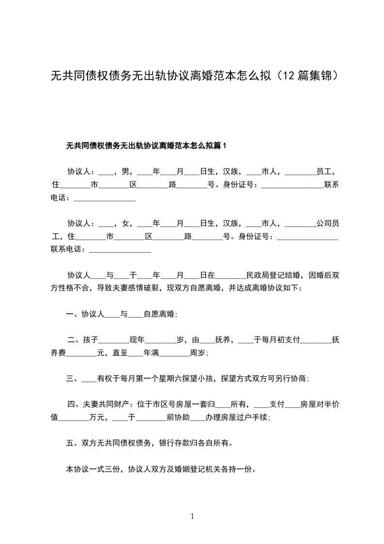 无债权无出轨协议离婚范本样本篇1
