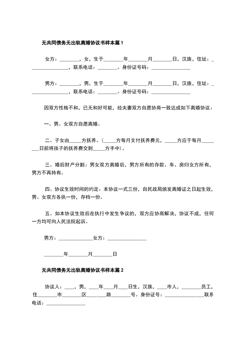无债权无出轨协议离婚范本样本篇10