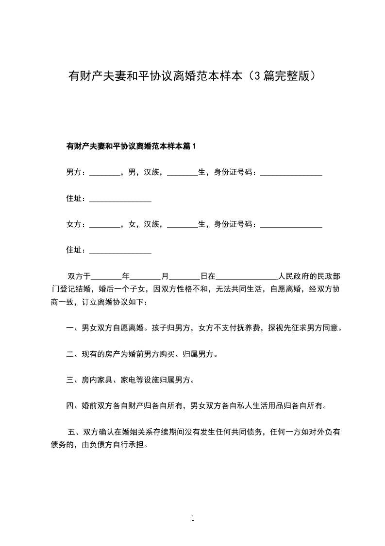 有财产夫妻和平协议离婚范本样本篇3