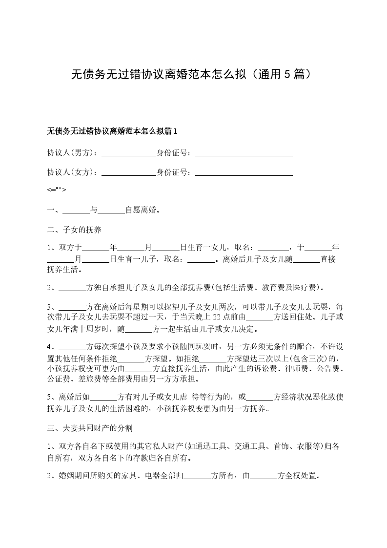 无债务无过错协议离婚范本怎么拟篇5