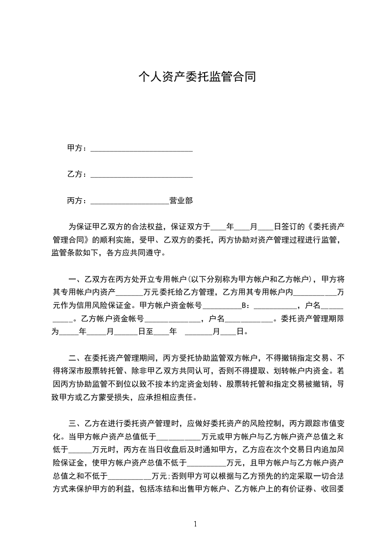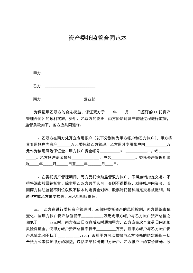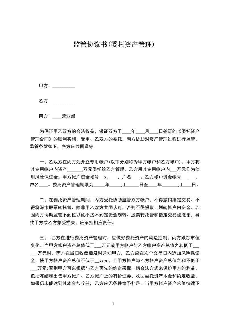 为保证甲乙双方的合法权益,保证双方于____年____月____日签订的《委托资产管理合同》的顺利实施,受甲、乙双方的委托,丙方协助对资产管理过程进行监管,监管条款如下,各方应共同遵守。
