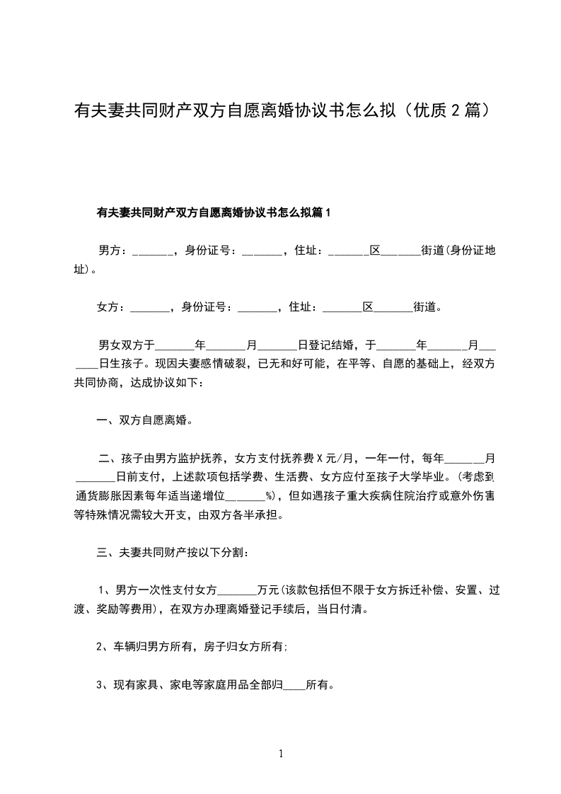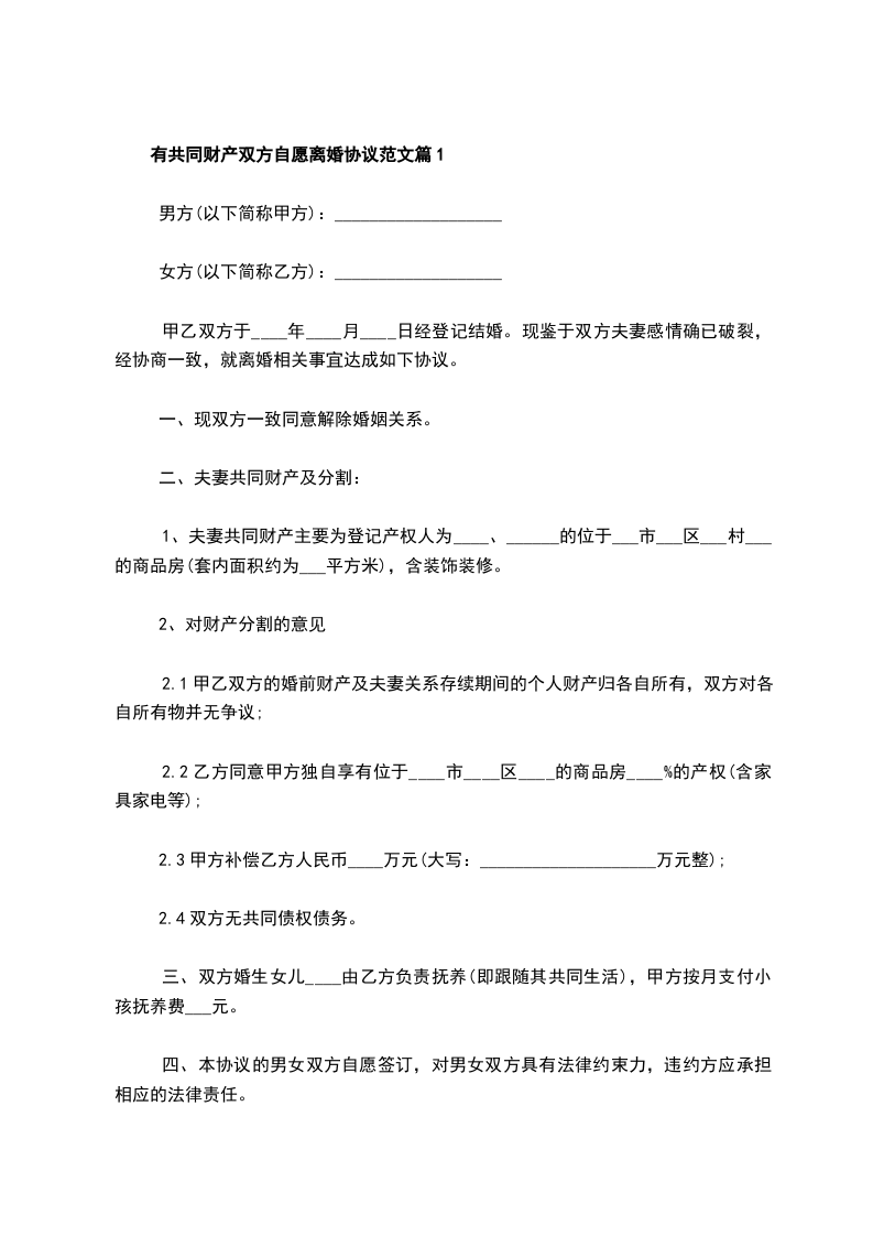 有共同财产双方自愿离婚协议范文篇1