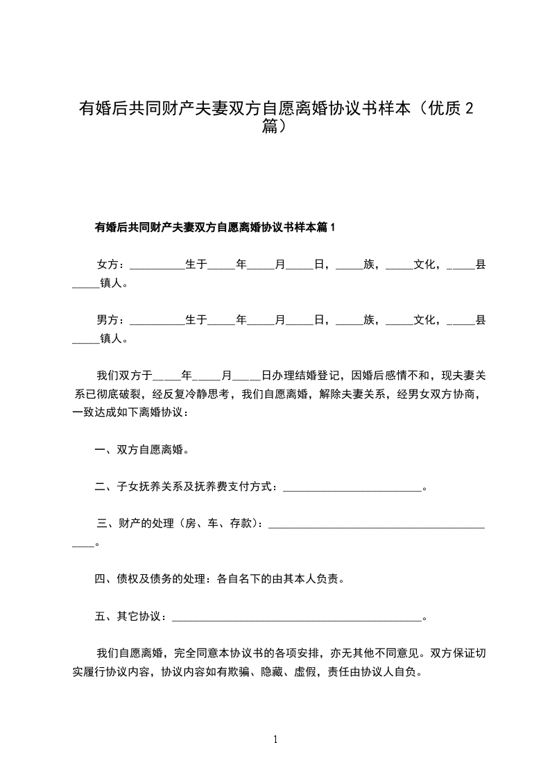 有共同财产双方自愿离婚协议范文篇2