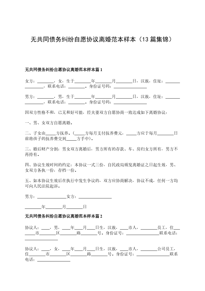 无共同债务纠纷自愿协议离婚范本参考样本篇13