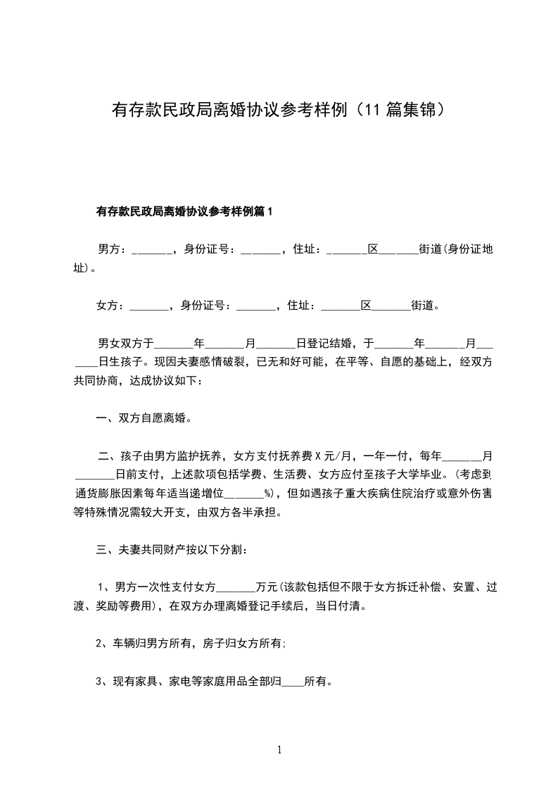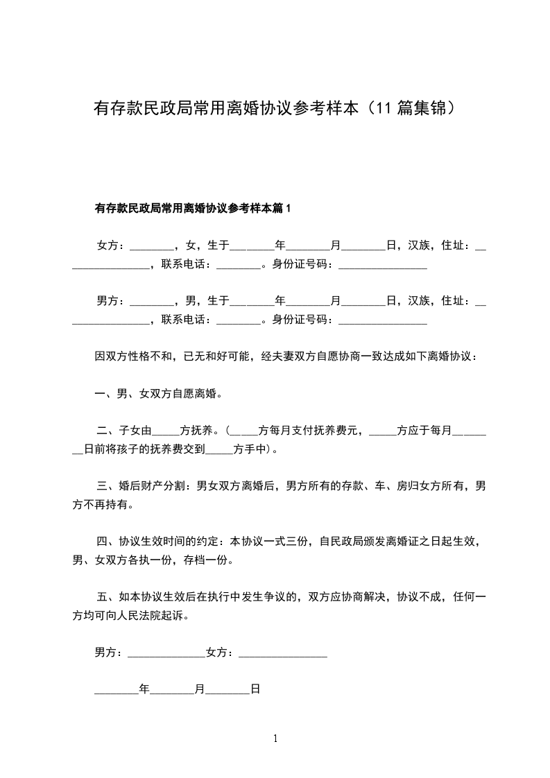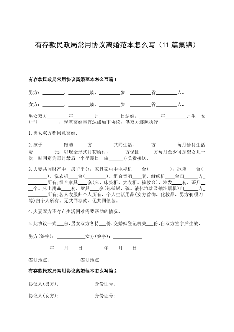 有存款民政局常用离婚协议怎么写篇11