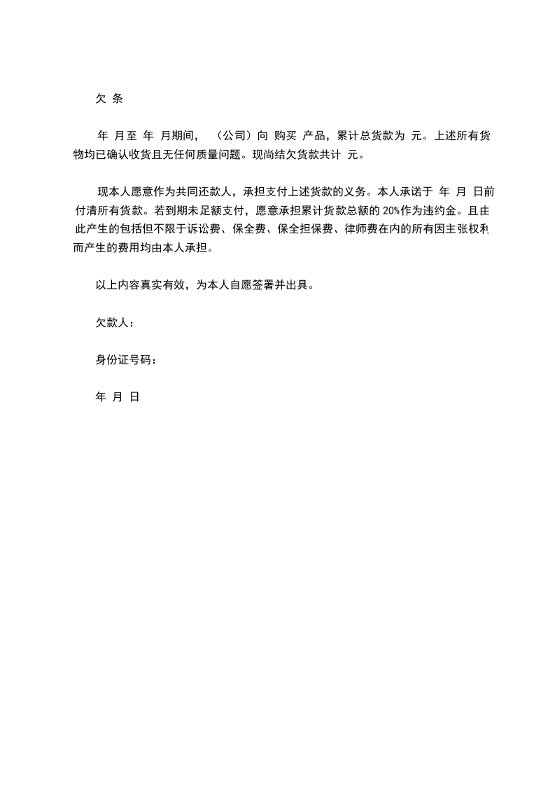 现本人愿意作为共同还款人,承担支付上述货款的义务。本人承诺于 年 月 日前付清所有货款。若到期未足额支付,愿意承担累计货款总额的20%作为违约金。且由此产生的包括但不限于诉讼费、保全费、保全担保费、律师费在内的所有因主张权利而产生的费用均由本人承担。