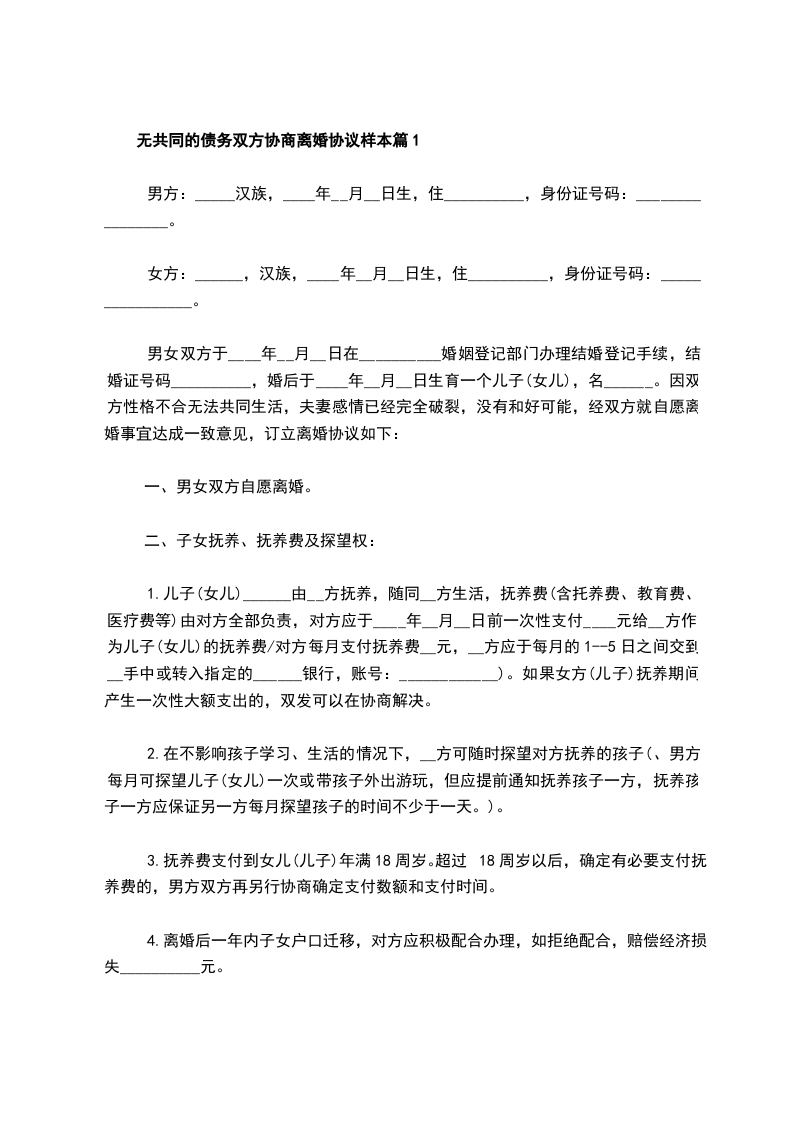 无共同的债务双方协商离婚协议样本篇1